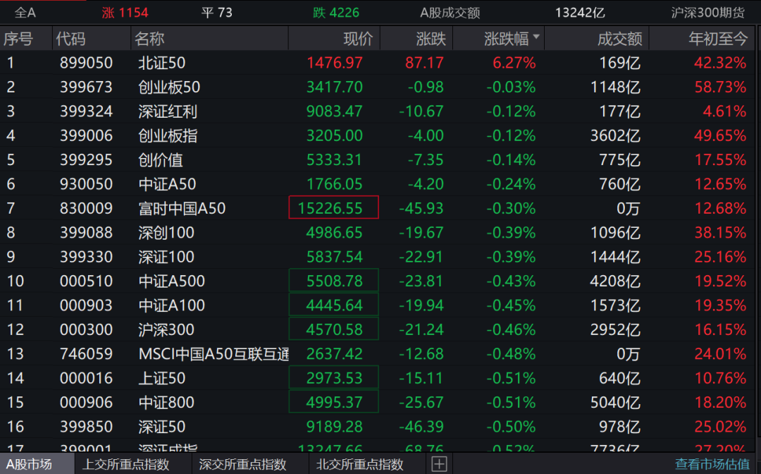 昨天市场整体比较低迷,午后,北证50突然爆发,盘中一度涨超6%,截至13:30,是A股38只宽基类指数中,唯一飘红的。