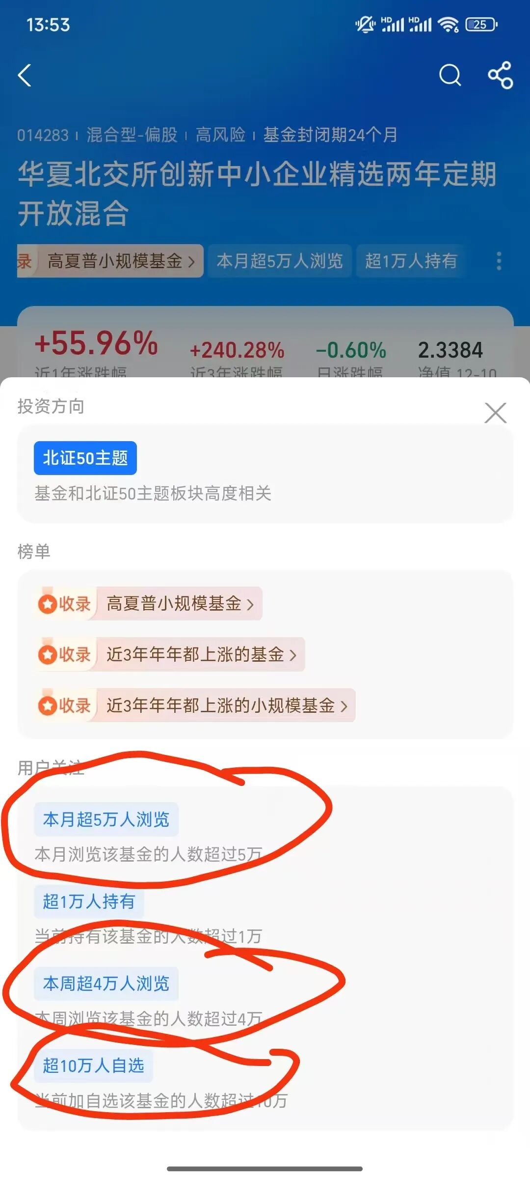 拿规模最大10亿元(截至Q3)的这只华夏北交所定开基金来说,总共才1万人持有,但本周居然有4万人在浏览。