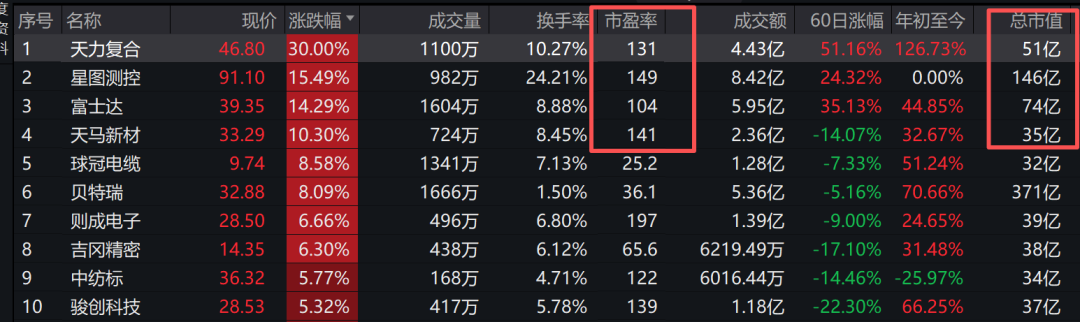 基哥盘了下截至发稿时,涨的最好的几只北交所成分股,基本金属类、航空航天软件类,都是热门方向,市盈率和科创板那些同行也差不多,100-150倍,但胜在市值低。(这就是基民们现在还想入场的原因吗?炒小炒新)