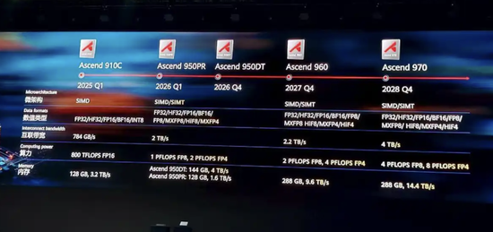 4、2028 年 Q4,昇腾 970 登顶国产巅峰!算力再翻一倍达 4PFLOPS(FP8)/8PFLOPS(FP4),内存带宽炸到 14.4TB/s,直接代表国产 AI 芯片的最高水平,把高端 AI 应用的 “算力天花板” 捅破!