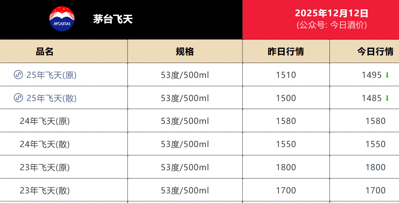 上证报中国证券网讯(记者 高志刚)据酒业数据平台“今日酒价”12月12日最新数据显示,25年飞天茅台(散瓶)批发价为1485元/瓶,较昨日下跌15元;25年飞天茅台(原箱)价格报1495元/瓶,较昨日下跌15元。这一价格已经跌破1499元/瓶的茅台官方指导价。